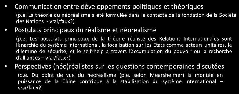 - Communication entre développements politiques et théoriques (p.e. La théorie de l’institutionnalisme libéral (néolibéralisme) a été formulée dans le contexte de la fondation de la Société des Nations - vrai/faux?).