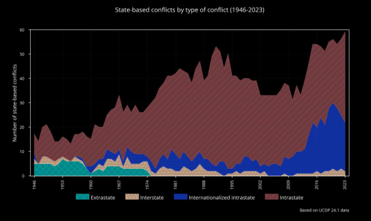 - Aujourd’hui ce qui prédomine c’est surtout les guerres intrastate et souvent internationalisées (ingérence de puissances extérieures→ internationalised intrastate).
