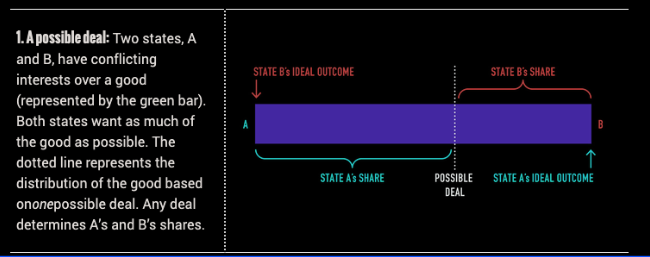 - Dans le cas où A ou B attaque en premier, le résultat de la guerre favorise largement celui qui attaque en premier. De telle sorte que les fourchettes de négociation ne se superposent pas.