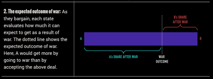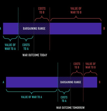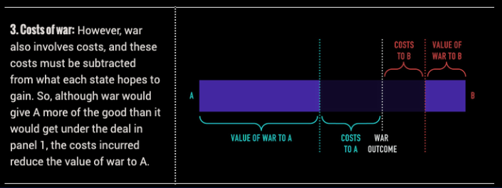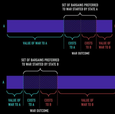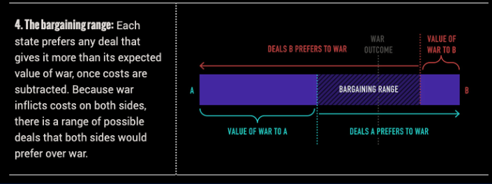 - Les coûts de la guerre assurent qu’il existe un arrangement pacifique qui satisferait les deux parties (au sein de la fourchette de négociations).