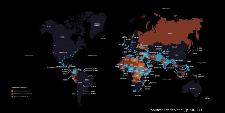 - Insurrection (insurgency): stratégie militaire selon laquelle des petites unités, souvent avec des armes légères, s’engagent dans des attaques ‘hit-and-run’ contre des cibles militaires, gouvernementales ou civiles (Frieden et al.,p. 262).