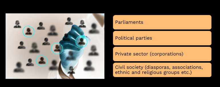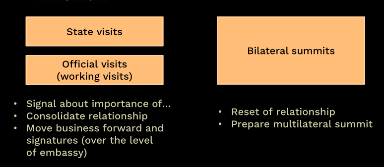 Nowadays less receptional and fancy invitations but channels targeted at concrete objectives. Very diverse, even civil society included.
