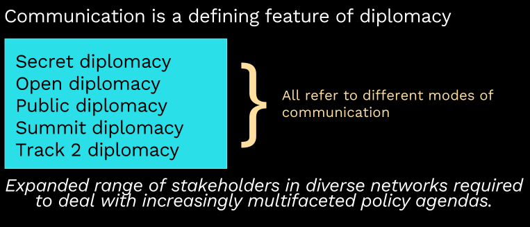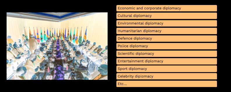 Police diplomacy and scientific diplomacy, as well as entertainment diplomacy recently developed (example of swiss dj at the same time he was a diplomat for NATO that got connections going further than the contacts HC had access to as a partner). We also have celebrity diplomacy, like UN ambassadors that have to pass messages.