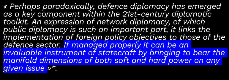 Perhaps paradoxically, defence diplomacy has emerged as a key component within the 21st-century diplomatic toolkit. An expression of network diplomacy, of which public diplomacy is such an important part, it links the implementation of foreign policy objectives to those of the defence sector. If managed properly it can be an invaluable instrument of statecraft by bringing to bear the manifold dimensions of both soft and hard power on any given issue.
