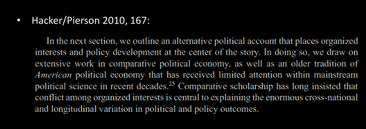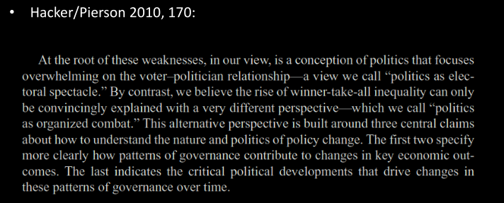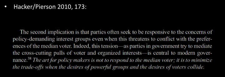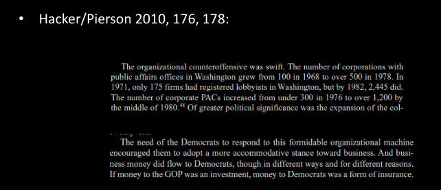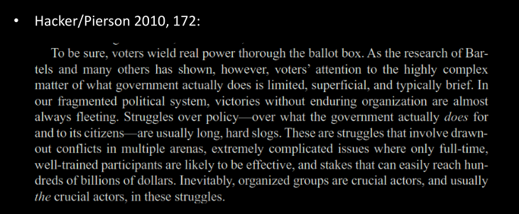 • Interest groups also seek to affect electoral politics, e.g. with campaign contributions, by endorsing candidates etc. (Pierson and Hacker acknowledge this.)