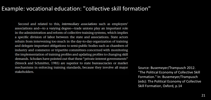 • E.g.: To fight inflation, trade unions agree to slower wage growth, employers promise new investment and the government reduces value-added taxes. Without institutionalisation of communications this is not possible, e.g. USA. In CH we can though.