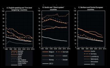 • Decline of union membership in most countries since 1980.