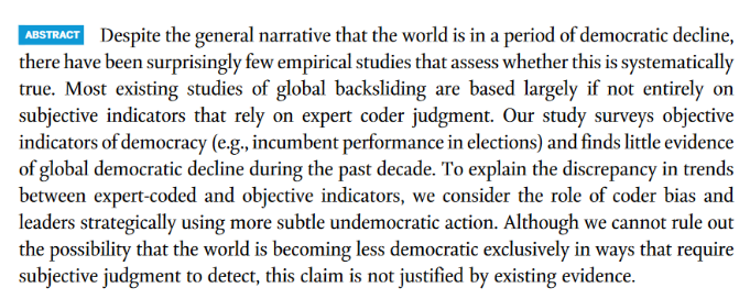 Problem: can hardly be used to measure change within single countries (except for 3→media freedom). Backsliding does not immediately start with rules changing in many countries.