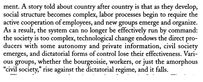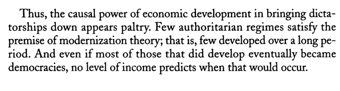 - Barrington Moore, 1966: No bourgeois, no democracy.