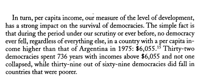 Basically the same arguments for the endogenous theory but kind of in a reversed mechanic. Plus, wealthy democracies can absorb shock and provide public goods which reduces loss of faith in the current system. This allows a solidification of the norms and rules in place as time goes by which makes backsliding (authoritarianism in the case of this paper), unlikelier.