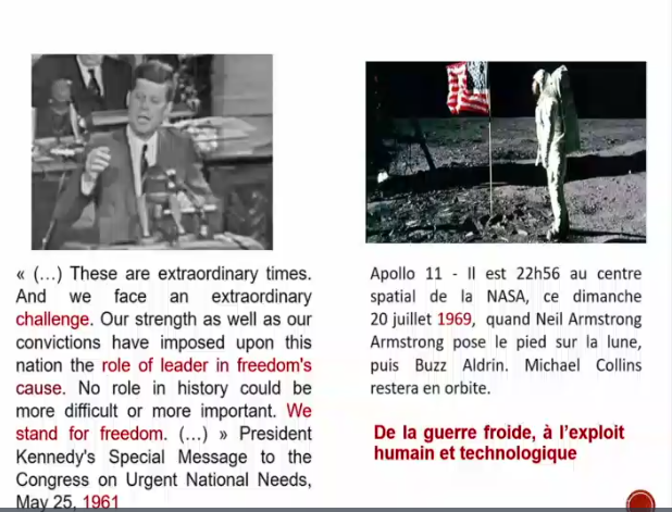 Fait par Kennedy, président avec une nouvelle politique et des nouveaux projets. Il politise le programme Apollo. Il affirme que les États-Unis ont le rôle of leader in freedom’s cause. C’est une façon de répondre aux avancées technologiques de l’URSS, qui a rencontré son succès en 1969.