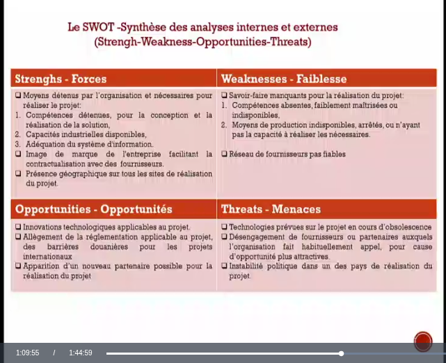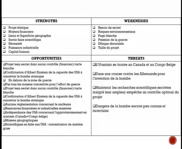On applique cette grille pour pouvoir identifier les forces, faiblesses, opportunités et menaces de notre projet. En général on fait ça au début, même si p.ex. on peut le faire rétroactivement avec Apollo 11 puisqu’il est déjà complètement clos.