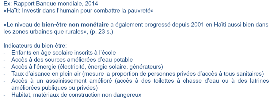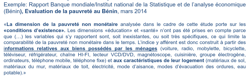 • Niveau de vie (accès à l’eau potable, assainissement, électricité, logement, etc.). On parle d’« indicateur de pauvreté humaine » pour souligner que la pauvreté ≠ manque d’argent seulement, mais manque de capacités et d’accès aux biens et services essentiels.