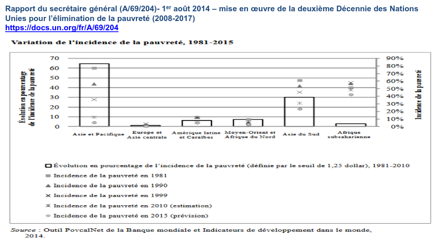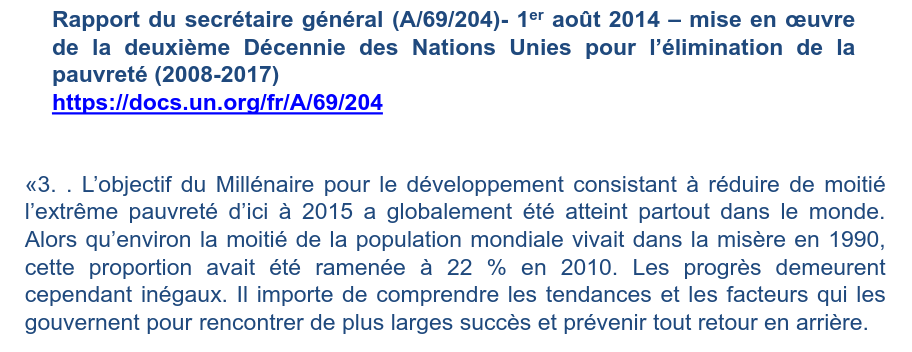 L’objectif du millénaire atteint mais inégalement (en termes de pauvreté absolue). Mais bon il y a toujours 22% de misère. L’influence provient surtout de la Chine (Asie du Sud).