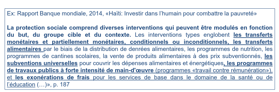 • La BM dit en gros que tout ce qu’on peut offrir à la population c’est des filets sociaux pour un soulagement ponctuel de la pauvreté mais pas un système sur le long terme pour de la sécurité.