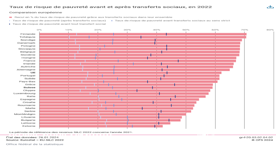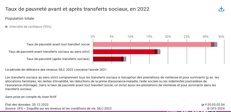 30% de pauvreté sans transferts, Genève particulièrement touchée (entre 30 et 40% de la population qui reçoit une aide sociale). Au sens strict veut dire sans prestations vieillesse (très répandues, même si ça veux pas dire qu’on peut vivre dignement à partir de celles-ci).