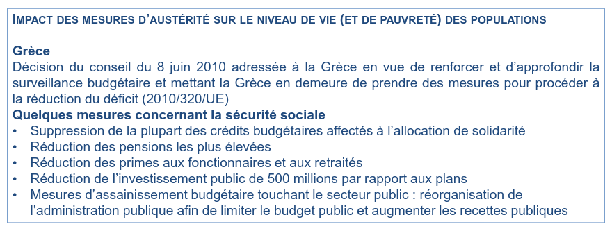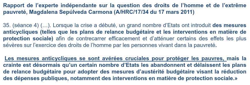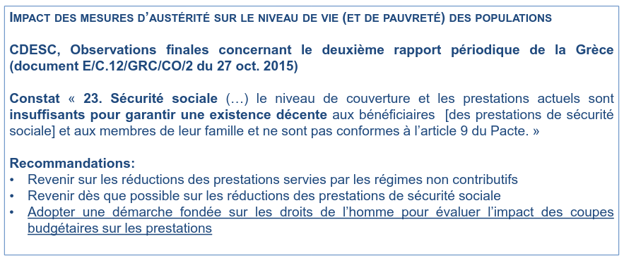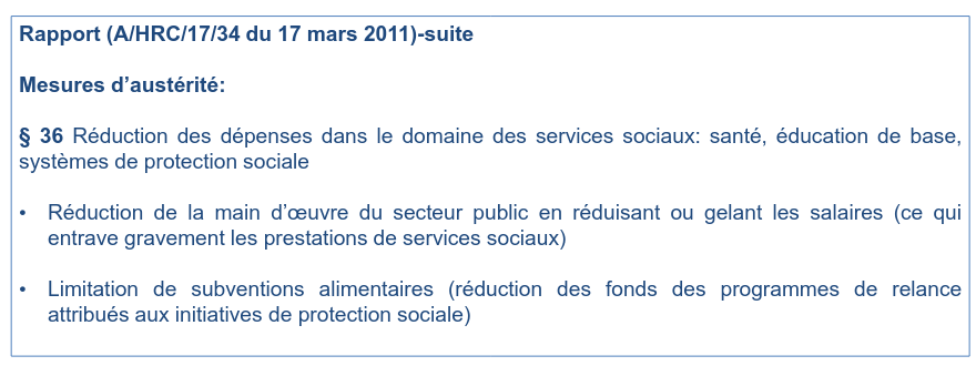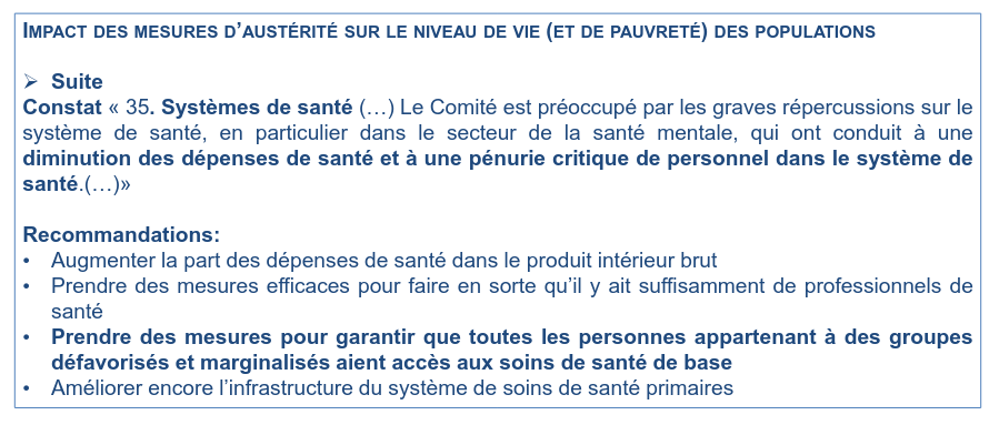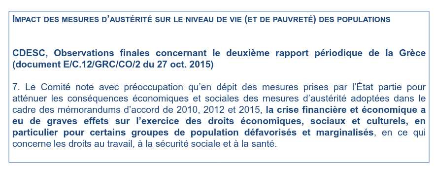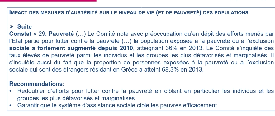 • Comme on l’a vu dans Séance 4-Les risques. La Grèce a ratifié le PIDESC et donc doit rendre des rapports sur ce qu’elle a fait pour garantir ces droits, le CDESC après fait ses observations. En gros les autorités publiques doivent prévoir l’impact sur les droits des individus de leur politiques, des fois cela arrive mais il faut respecter des conditions : faire des études (e.g. s’assurer que la politique va vraiment atteindre l’objectif poursuivi), essayer de réfléchir à la proportionnalité. On peut juste faire de la politique sans se préoccuper de rien, il y a des cas qui ont fini dans des juridictions. Donc la PS joue un rôle envers la pauvreté, tout comme l’instauration une austérité contre les mesures mises en place aussi (juste négativement). La santé fait partie de la PS et donc le fait qu’elle ne soit pas assurée justifie les recommandations données. On peut imaginer que tout cela peut s’appliquer à d’autres pays qui ont aussi mis en place des mesures d’austérité.